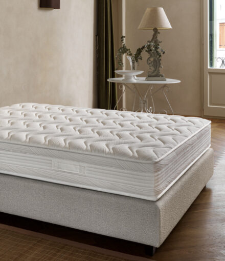 Il profilo superiore in Visco Memory bugnato si adatta al corpo riducendo i punti di pressione, mentre quello inferiore in Evocell, certificato Hygcen®, assicura traspirabilità, igiene e stabilità. Il box spring completa la struttura offrendo maggiore tenuta.
