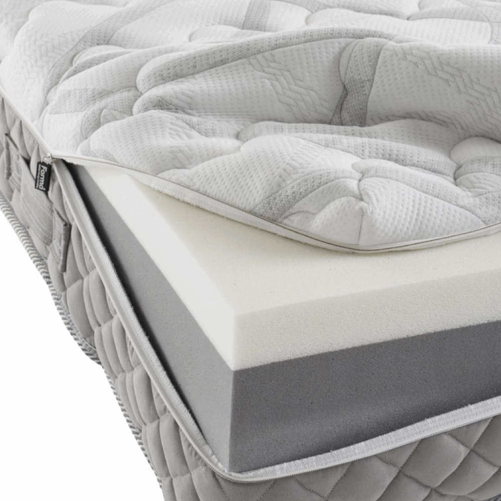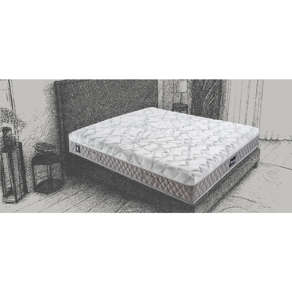 Tessuto superiore e inferiore da 560 gr/m² con 65% tencel, antibatterico e termoregolante, e con filati di poliestere “Sea Quality” green ottenuto dal riciclo delle plastiche recuperate dagli oceani. Imbottitura lato superiore con 2 cm di memory foam D50 e lato inferiore con falda di poliestere da 2 cm.