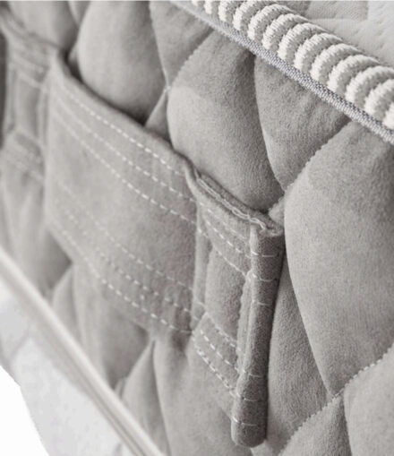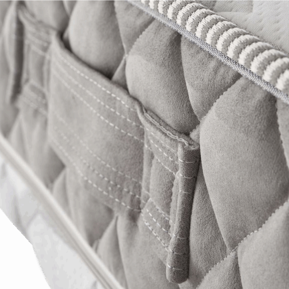 Fascia perimetrale in due colori e due trapuntature differenti, con la parte superiore in continuità con il rivestimento del materasso e la parte inferiore trapuntata in colore grigio completa di 4 maniglie. Zip centrale e bordatura tono su tono nella parte inferiore. Tirazip personalizzato Forma.