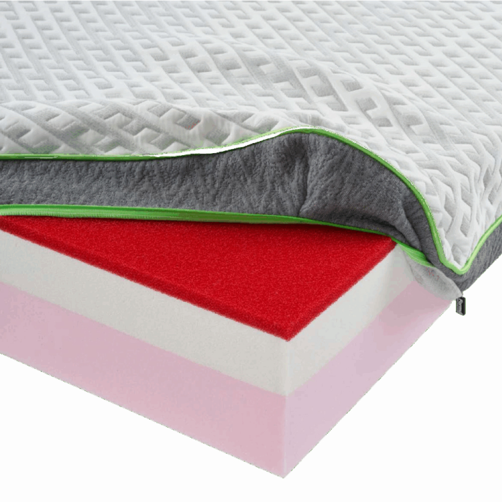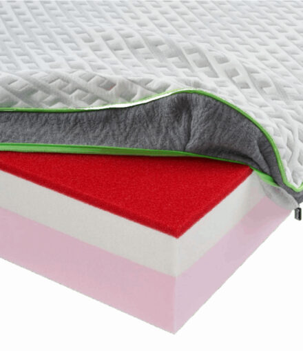 Lastra con triplo strato composta da una base di poliuretano tecnico schiumato ad acqua D30 con 8 cm di memory foam D60 e 2 cm di DryFeel, materiale alveolato