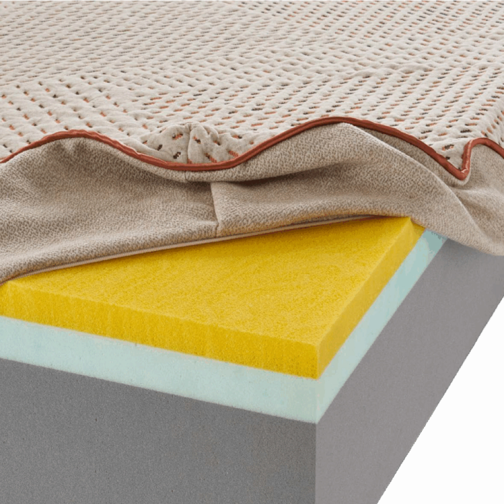 Triplo strato composto da una lastra da 15 CM di schiumato ad acqua Lympha grigio D55 con strato di 4 CM di schiumato ad acqua ad elevata traspirabilità biogreen D45 e 5 CM di esclusivo memory foam FormaFresh Breeze Oro D60.